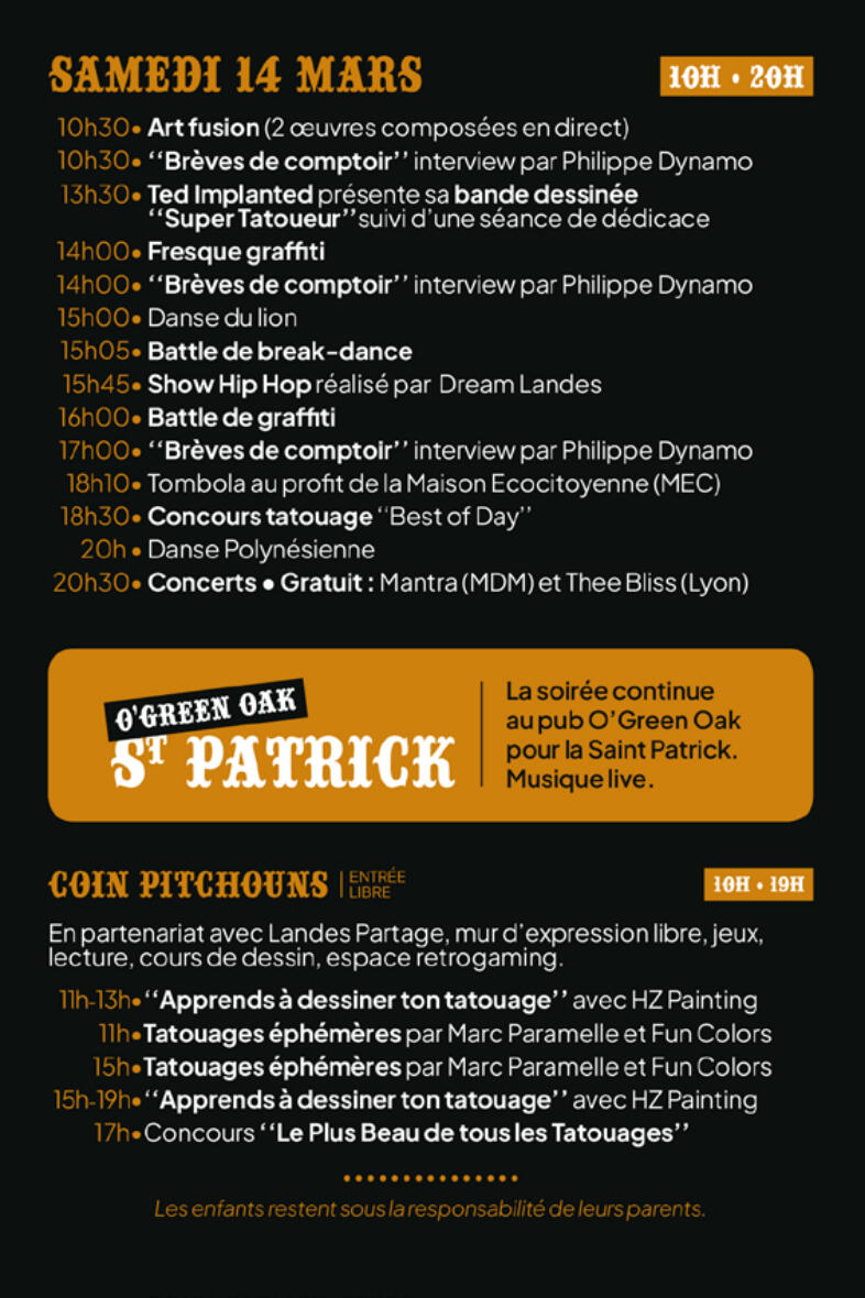 Cette convention de tatouage montoise rend hommage aux pionniers du tatouage. Pour l'occasion, ils sont rejoints par la nouvelle vague de tatoueurs et tatoueuses engagés pour partager et échanger autour de leur passion commune.A Mont de Marsan ce sera une convention familiale avec une sélection d'artistes. Il y a du tatouage bien sûr, des retrouvailles, des concerts, des concours et comme d'habitude des expositions partout en ville !!!